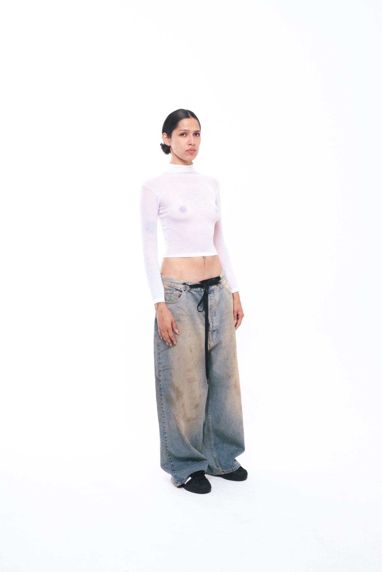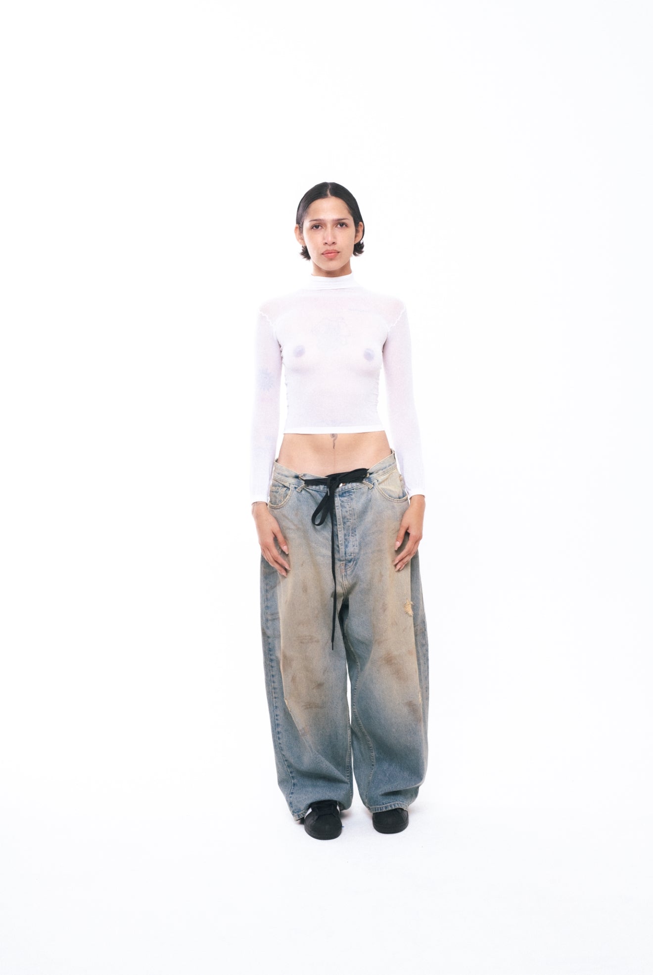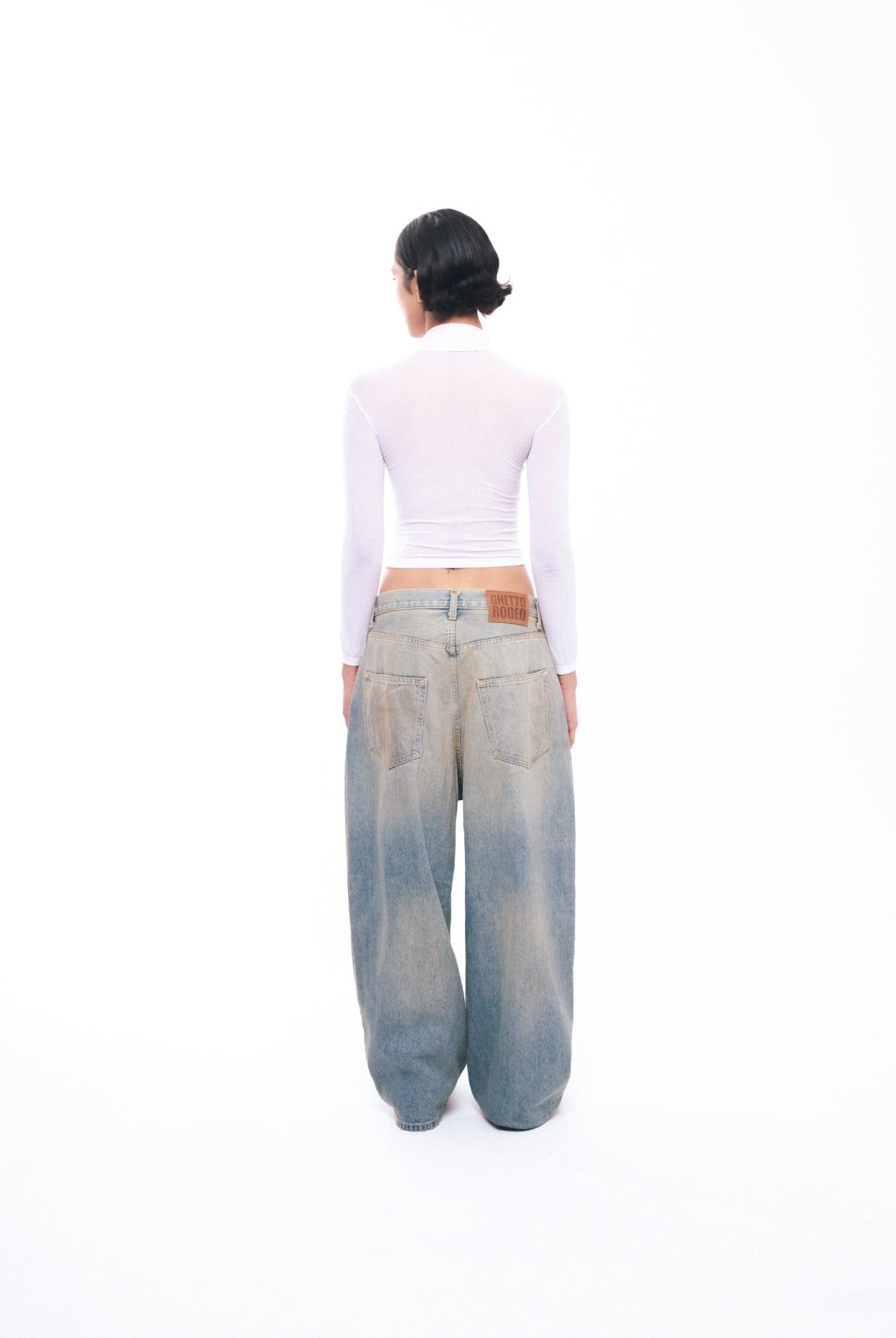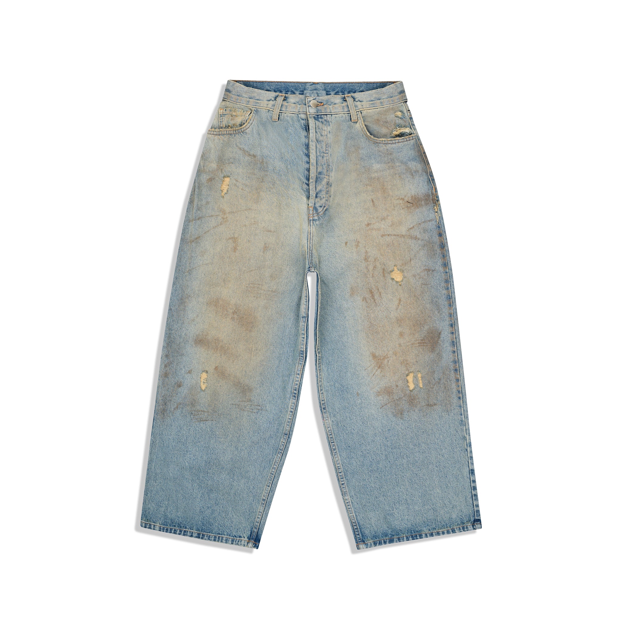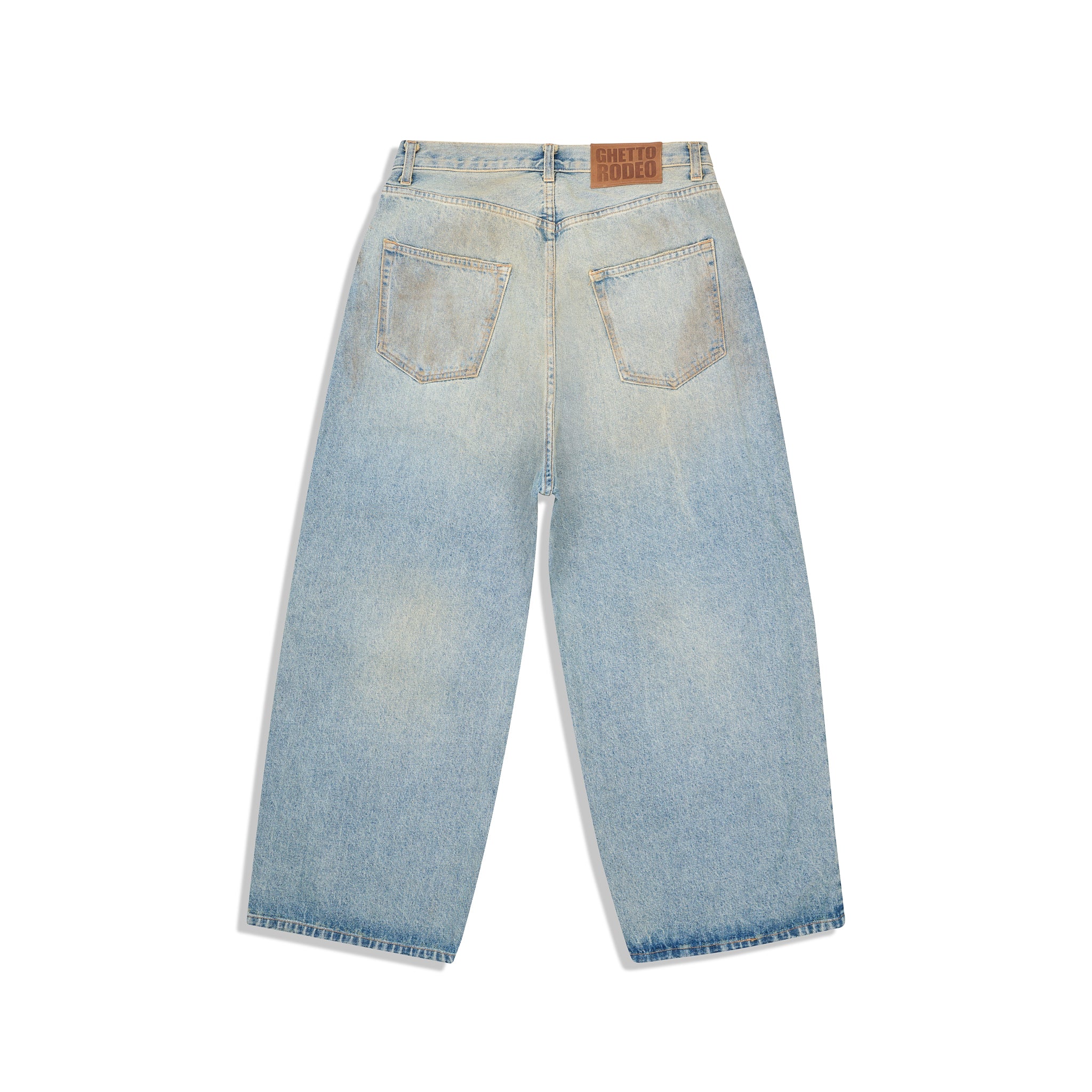 Introducing the Ghetto Rodeo Denim - Designed, cut, and sewn in the heart of Los Angeles, this wide-legged, drop-crotch silhouette is treated with a light blue wash, subtle distressing, and a distinctive mud wash finish.